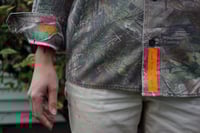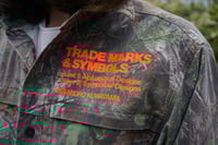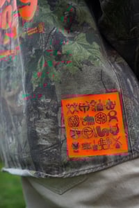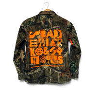 Several florescent orange heat-press embellishments on this one of a kind, reclaimed BREAKUP Infinity™ camouflage long-sleeve, button-down shirt.